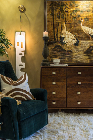 A full Living room refresh using a blend of vintage of organic modern furniture. Leana hand painted the feature wall with mustard/honey tones blended to give a Mediterranean aesthetic finish. The goal was to showcase the large Japanese crane statement artwork that was sourced from a flea market. Including a prized vintage set of Alrob walnut stained drawers with brass handleware and accents throughout - and a fun play on styling asymmetry.