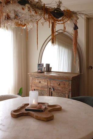 What started initially as a goal to create a space to welcome friends for entertaining - became a haven for connection, grounding and healing conversation through a more natural and organic modern environment. Tapping into the client's ancestry and creating a moodboard that spoke of warm and inviting tones, this client's home became a little tucked away sanctuary. Featuring a hand refurbished vintage buffet , living room wall adorned with a muted nordic forest mural wallpaper, upcycled oversized rattan pendant lamp and a custom dried botanical dining halo arrangement for curious conversations over cups of tea.